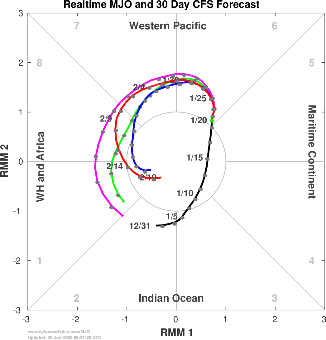 The black line shows the last 20 days of MJO activity, and the colored lines are the 4 ensemble members. Click image for full size.